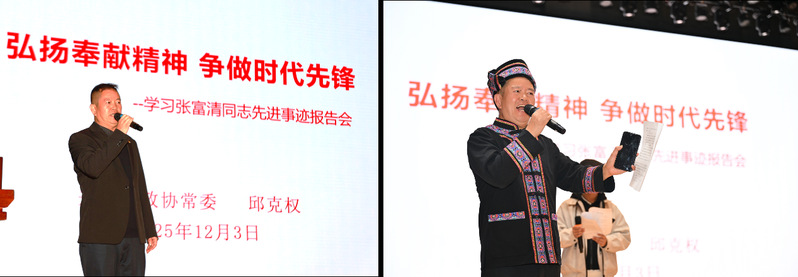 报告会上,邱克权以大量珍贵的历史图片、影像资料和深入走访调研的一手素材,深情回溯了张富清老英雄深藏功名、无私奉献的一生。报告形式生动丰富,情感真挚。在回顾张富清同志在来凤县扎根基层的片段时,更巧妙穿插情景演绎,再现老英雄带领乡亲修路的动人场景。“道路修通、群众欢呼”的呈现,赢得全场热烈掌声。